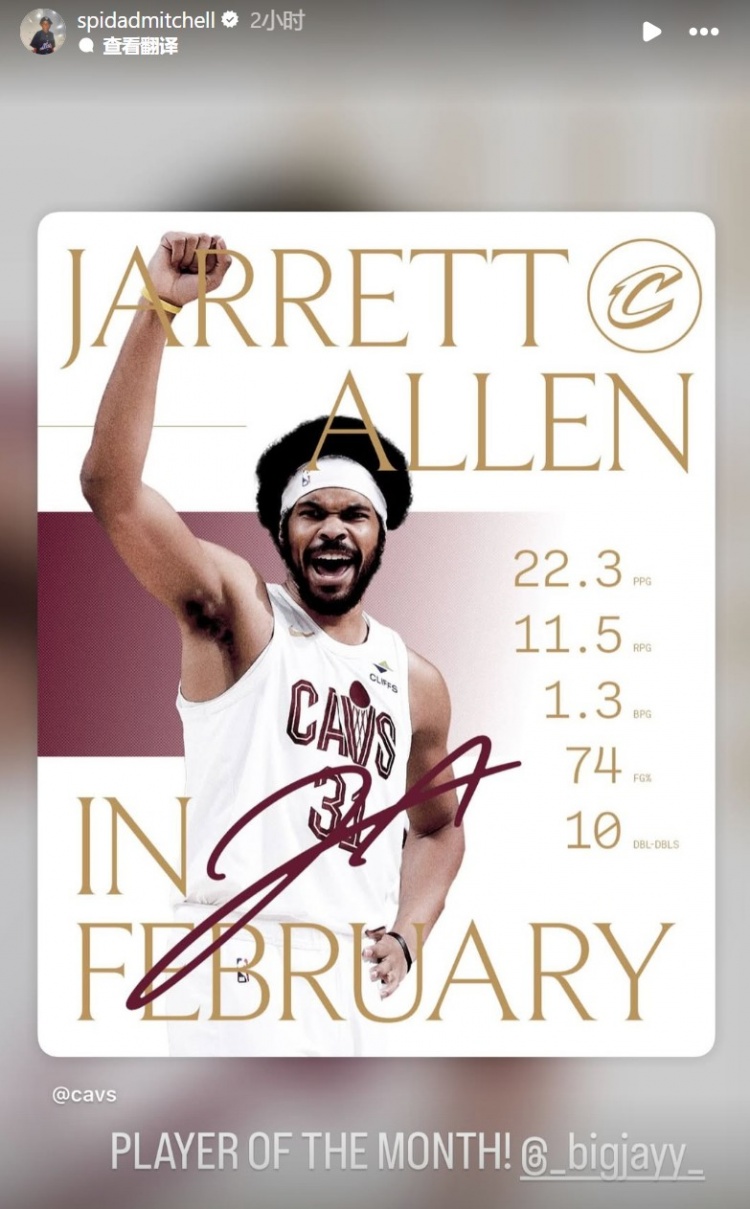 3月1日讯 今天,骑士官方晒出了贾勒特·阿伦二月份的数据,场均能得到22.3分11.5篮板1.3盖帽,投篮命中率74%,得到10次两双。