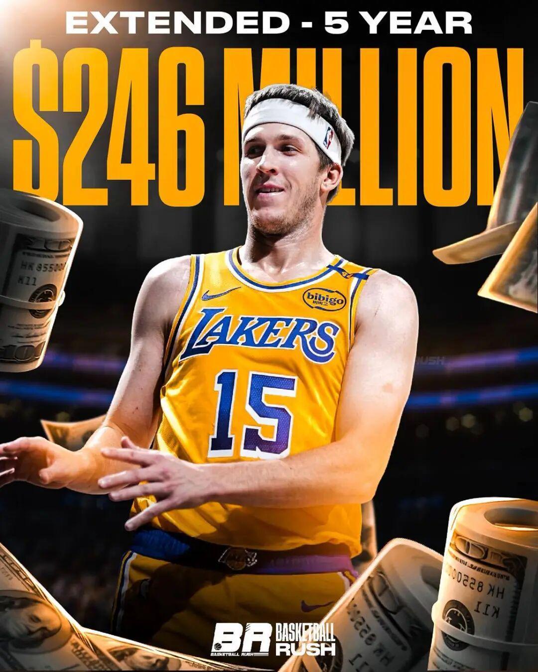 从饮水机开始,2年底薪,到4年5600万,再到现在5年2.4亿,里夫斯用了5年时间完成了人生的三级跳,成为了湖人未来十年的双子星门面。